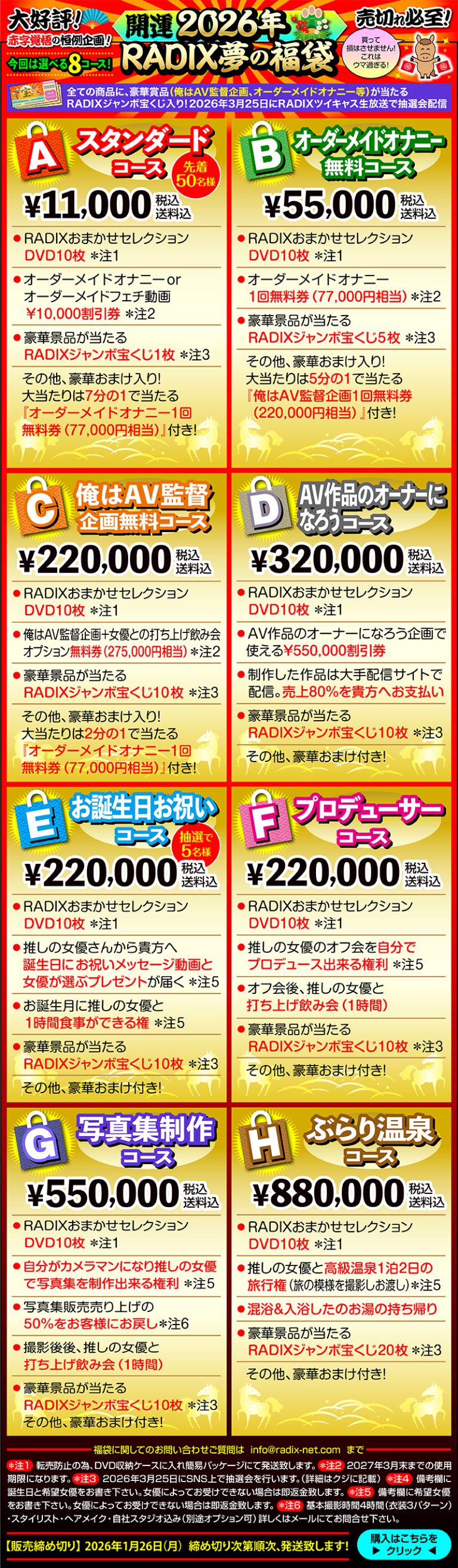 【A】スタンドコース ¥11,000(税込・送料込)【B】オーダーメイドオナニー無料コース ¥55,000(税込・送料込)【C】俺はAV監督企画無料コース ¥220,000(税込・送料込)【D】AV作品のオーナーになろうコース ¥320,000(税込・送料込)【E】お誕生日お祝いコース ¥220,000(税込・送料込)【F】プロデューサーコース ¥220,000(税込・送料込)【G】写真集政策コース ¥550,000(税込・送料込)【H】ぶらり温泉コース ¥880,000(税込・送料込)