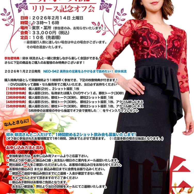 日 時 卯水 咲流 リリース記念オフ会日時:2026年2月14日 土曜日時間:13時~16時場所:東京・某所(参加者のみ、お知らせいたします。)会費:33,000円(税込)定員:10名(先着順)※最低催行人数に達しない場合は中止の場合がござ...